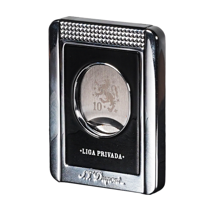 S.T. Dupont Accessories Included – Custom Ligne 2 Palladium lighter and Chrome cigar stand cutter, both engraved with Liga Privada 10 branding.